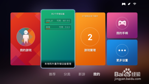 我的栏目里,主要是写设置上的东西了,包括手柄啊,游戏管理啊一些的东西,而这边的储存空间,我要小小的提一下,这边他会显示你的设备内存和你的外设内存,小喷之前在PK云游戏机的时候提到过,云游戏机的主要优势是在在线提供体验游戏的快感,而K主要还是靠下载游戏,当然一些FC的游戏也就那么一丢丢大,所以你不用在意盒子的内存问题,但是一旦你要问更新版本后的一些大型游戏,那我劝你还是准备一个U盘或是移动硬盘吧,否则几个游戏或者是一个游戏更或者你连一个游戏都没下载,你的内存就满了,当然这边是支持你选择下载后的存储空间位置的,如果本身盒子大的话你可以直接装在盒子或是电视里,如果小的话,就直接装在U盘或是硬盘里。